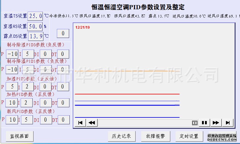 恒温恒湿控制系统,与传统的空调相比不但节约了大量的能源,而且压缩机年平均工作时间出大大的减少,提高了设备的使用寿命。华利机电采用西门子PLC作为核心控制单元,工作稳定性好,抗干扰性强。本系统采用的温湿度采用的温湿度变送器为数字量传送,传送距离远,不受到过程干扰,控制精度高。